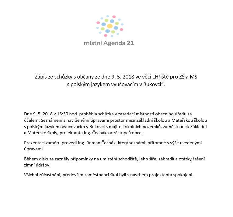 Místní Agenda 21 je tedy programem nejen konkrétních měst, regionů, ale i obcí, v našem případě Obce Bukovec, která aplikuje principy udržitelného rozvoje do praxe.