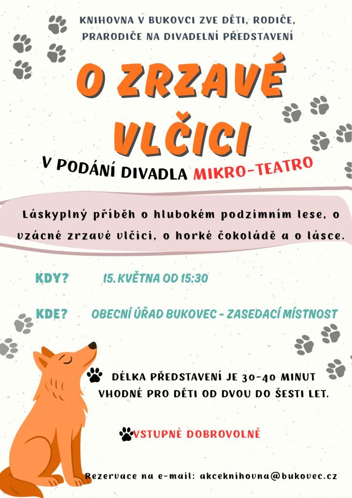 Knihovna v Bukovci pořádá divadelní představení, které je určeno pro všechny, kteří mají rádi pohádky a příběhy. Akce se uskuteční 15. 5. od 15:30 v zasedací místnosti obecního úřadu. Diváci se mohou těšit na láskyplný příběh o podzimním lese, vzácné zrzavé vlčici a horké čokoládě.