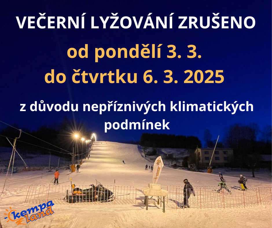 od pondělí 3. 3. do čtvrtku 6. 3. 2025 VEČERNÍ lyžování zrušeno!