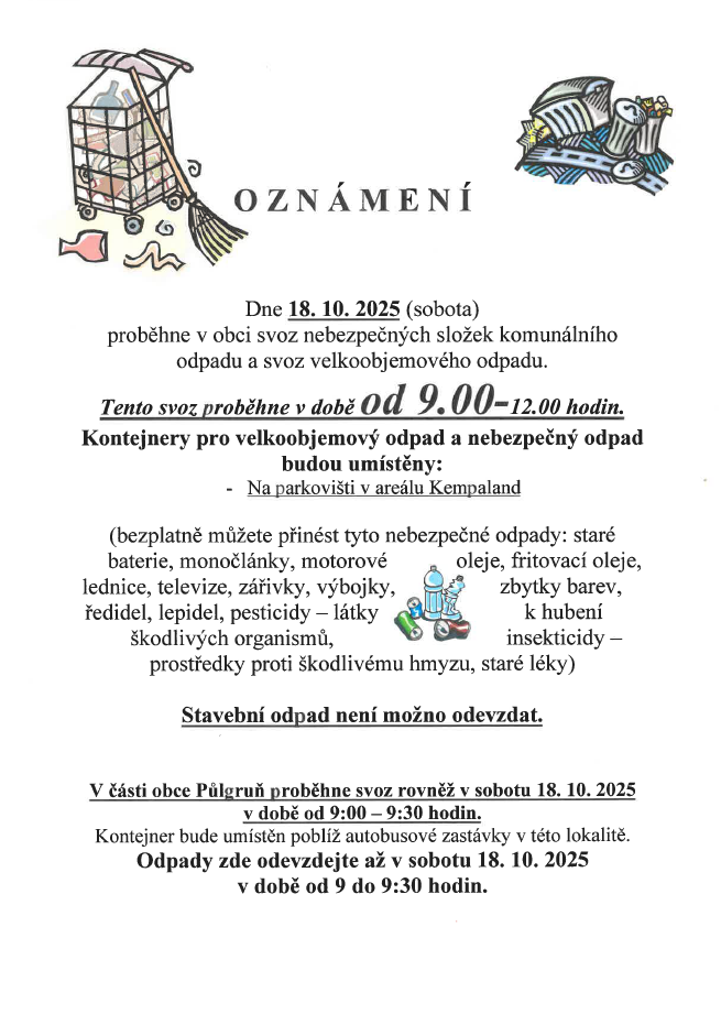 V lokalitě Půlgruň proběhne svoz od 9:00 do 9:30 hodin poblíž autobusové zastávky. Stavební odpad není možné odevzdat.