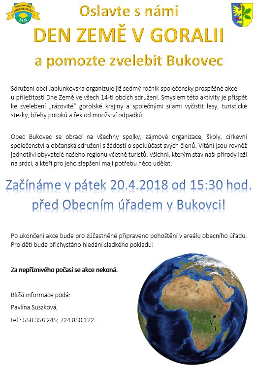 Prosíme občany o účast na jarním úklidu obce, u příležitosti Dne Země. Pro účastníky bude připraveno občerstvení v areálu Obecního úřadu.